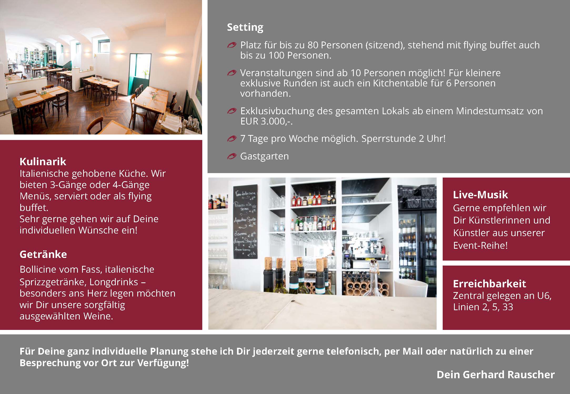 - Exklusivbuchung des gesamten Lokals ab einem Mindestumsatz von EUR 3.000,-.