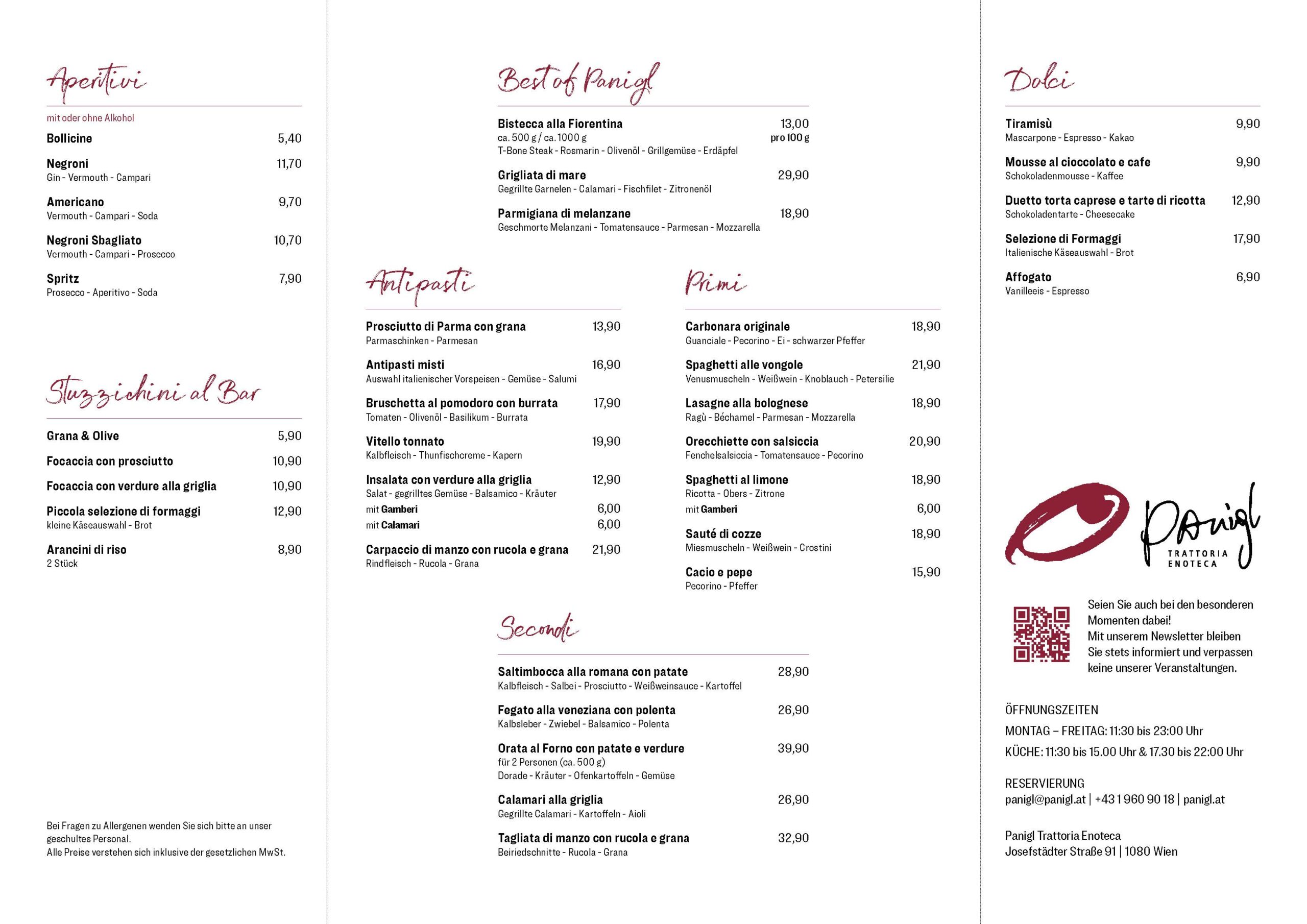 Im Panigl erwartet Sie im Sinne der alten „Panigl Tradition“ eine feine italienische Küche. Die Karte ist bewusst klein gehalten und wird immer frisch und kreativ um saisonale Gerichte erweitert.